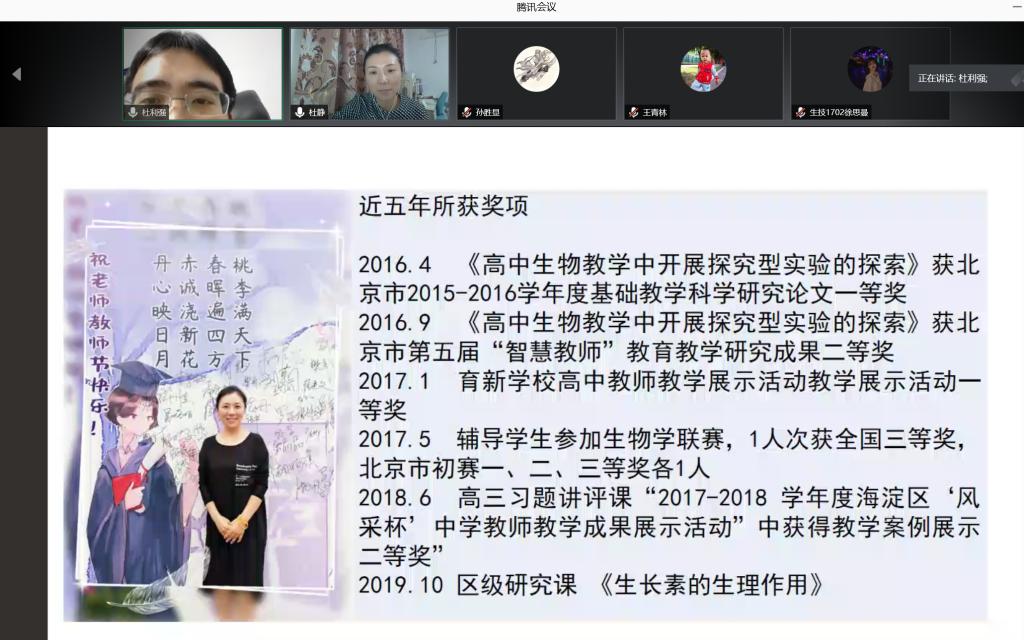 2020年10月10日晚上,学院邀请首都师范大学附属育新学校青年教师杜静老师通过网络对学院生物科学、生物技术、水产养殖等师范类学生进行《师范类职业素养养成及成长》的专题教育教学报告。 学院领导、专业老师和学生200人听取了报告。杜静老师是北京市海淀区海淀区青年先进教育工作者,海淀区青年教师岗位能手,“学生身边好老师”。杜静老师结合自身多年工作经验,通过对当前中学课程、教学改革、和考试变化进行分析,同时如何做一名优秀的中学教师所应具备的道德情操、教学素养、专业素质等多方面进行了具体阐述。会后,各位同学与杜静老师进行了深入交流,杜静老师对大家普遍关注的问题一一进行解答,报告取得良好的效果。